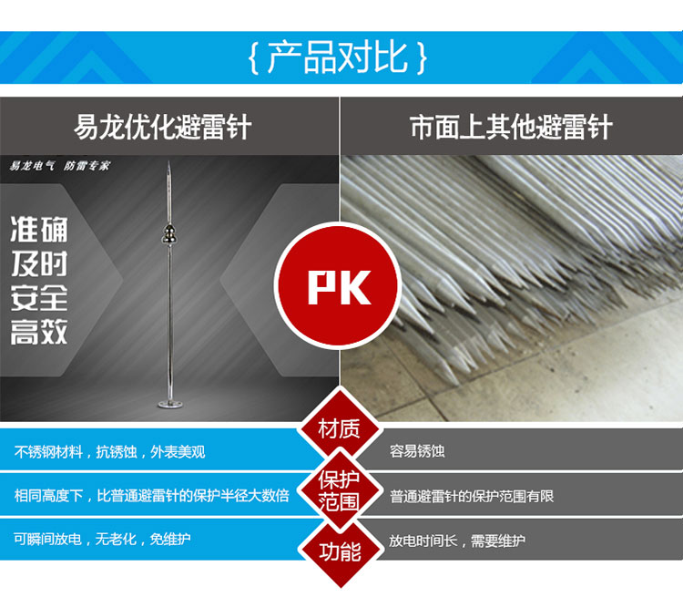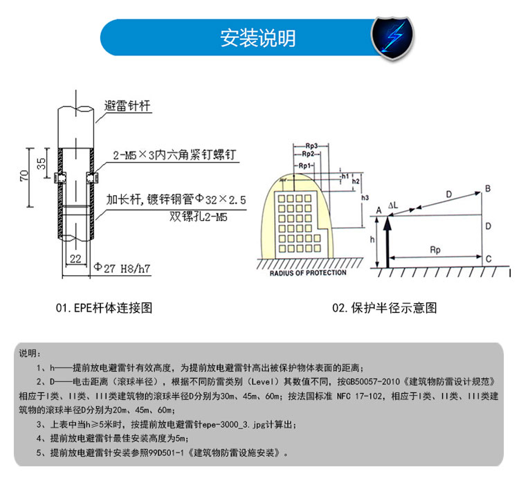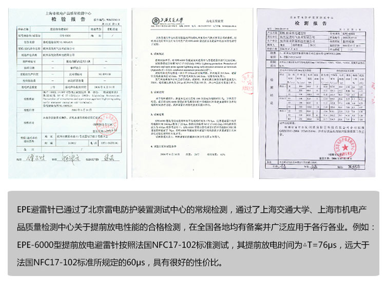EPE系列提前放電避雷針(以下簡(jiǎn)稱EPE避雷針)采用法國(guó)技術(shù),符合法國(guó)NFC17-102標(biāo)準(zhǔn)。它由三種系統(tǒng)(大氣電力電容器、高壓脈沖發(fā)送系統(tǒng)、電流泄放系統(tǒng))組成,具有雙重瞬間放電裝置,被多層的具有隔絕惡劣環(huán)境及水密性的材料所保護(hù);無(wú)老化危險(xiǎn),免維護(hù)。在相同的安裝高度下,比普通瞬間避雷針的保護(hù)半徑大數(shù)倍,搶先放電時(shí)間為30μs~60μs,即優(yōu)先引雷入地。